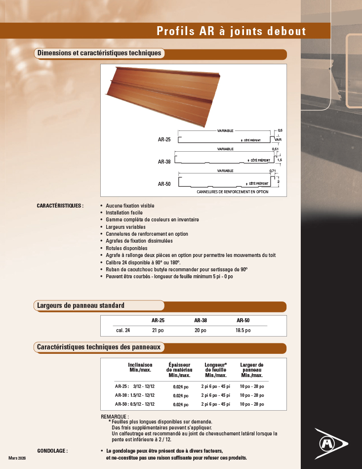 Notre toit de métal à joints debout AR est offert en calibre 24, en diverses largeurs et avec nervures de chevauchement latéral de 1, 1 ½ ou 2 po. La série AR de Agway comporte aussi des agrafes à rallonge deux pièces pour permettre les mouvements du toit. Les joints peuvent être à 90 ou 180 °. Pour des joints à 180 ° avec calfatage (facultatif), les panneaux peuvent être utilisés pour de faibles inclinaisons (AR-38 jusqu’à 1,5/12 et AR-50 jusqu’à 0,5/12).
