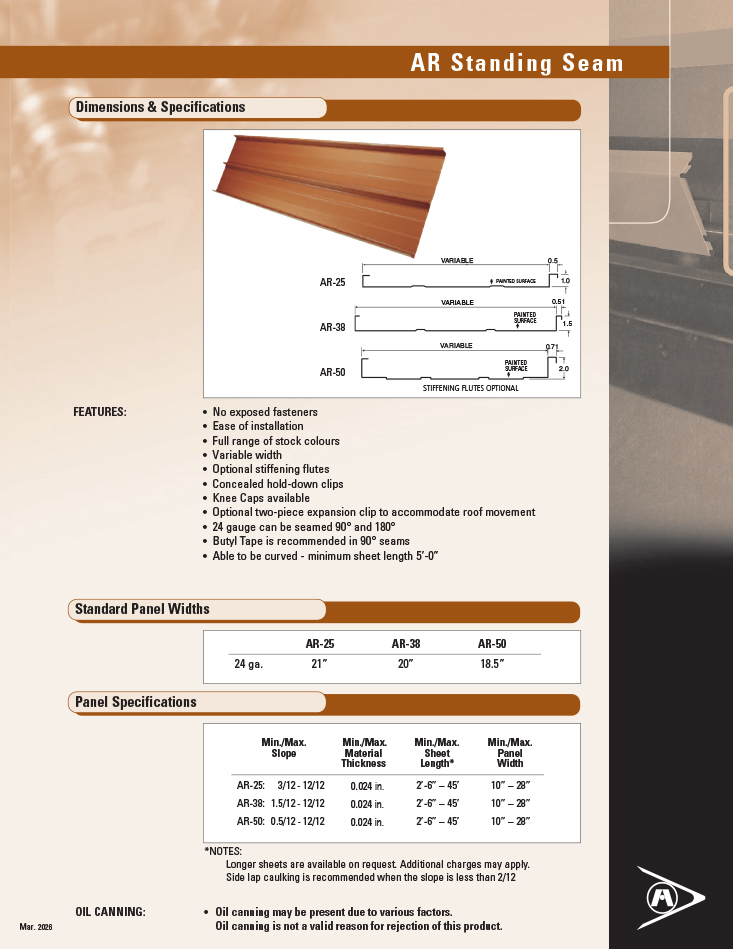 Our Standing Seam AR metal roofing is available in 24 gauge, in variable widths and with side lap rib heights of 1”, 1 ½” or 2”. Agway’s AR series also features optional, two-piece expansion clips to accommodate movement of the roof, and can be seamed at either 90º or 180º. With a 180º seam and optional seam caulking, panels can be used on low slopes (AR-38 down to 1.5/12 and AR-50 down to 0.5/12).
